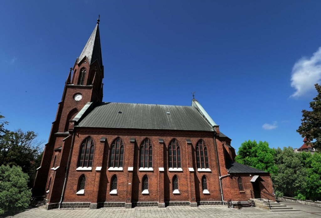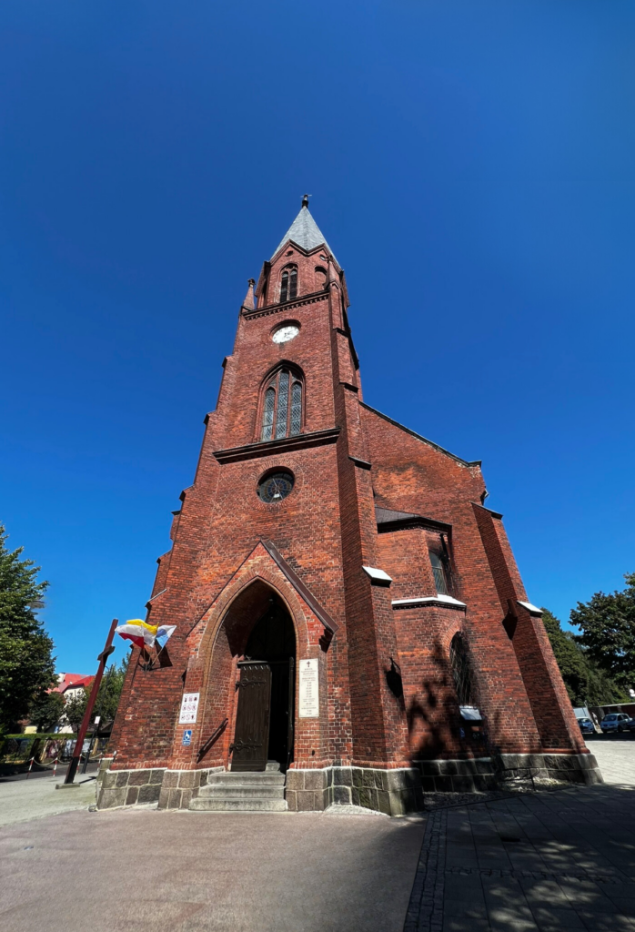 Neogotycki budynek świątyni jest orientowany, podobnie jak niegdyś kościół św. Mikołaja i św. Jana, a więc stoi na osi wschód – zachód z prezbiterium skierowanym ku wschodowi. Kościół został wymurowana z czerwonej cegły, na rzucie prostokąta, z wyodrębnionym prezbiterium zakończonym wielobocznie. Od frontu znajduje się wieża z ostrołukowym, profilowanym portalem, zakończona dachem ostrosłupowym. Kościół posiada okna ostrołukowe i drewniany, belkowany strop. Dach jest dwupołaciowy, a nad prezbiterium wielopołaciowy i kryty miedzianą blachą. Strzelistością wskazuje w symboliczny sposób na potrzebę wznoszenia się ku Bogu. Dominują kierunki pionowe, co szczególnie podkreślone jest na zewnątrz budynku poprzez podpory ścian kościoła. Również okna ze swoimi charakterystycznymi łukami ostrymi wskazują na niebo. Na zewnątrz można zobaczyć dużo, bardzo starannie wykonanych detali: archiwolty okienne oraz kwiatony wieńczące niewielkie wieżyczki, czy w końcu fryzy arkadowe, czyli szereg małych łuków, które wieńczą zewnętrzne ściany prezbiterium.
